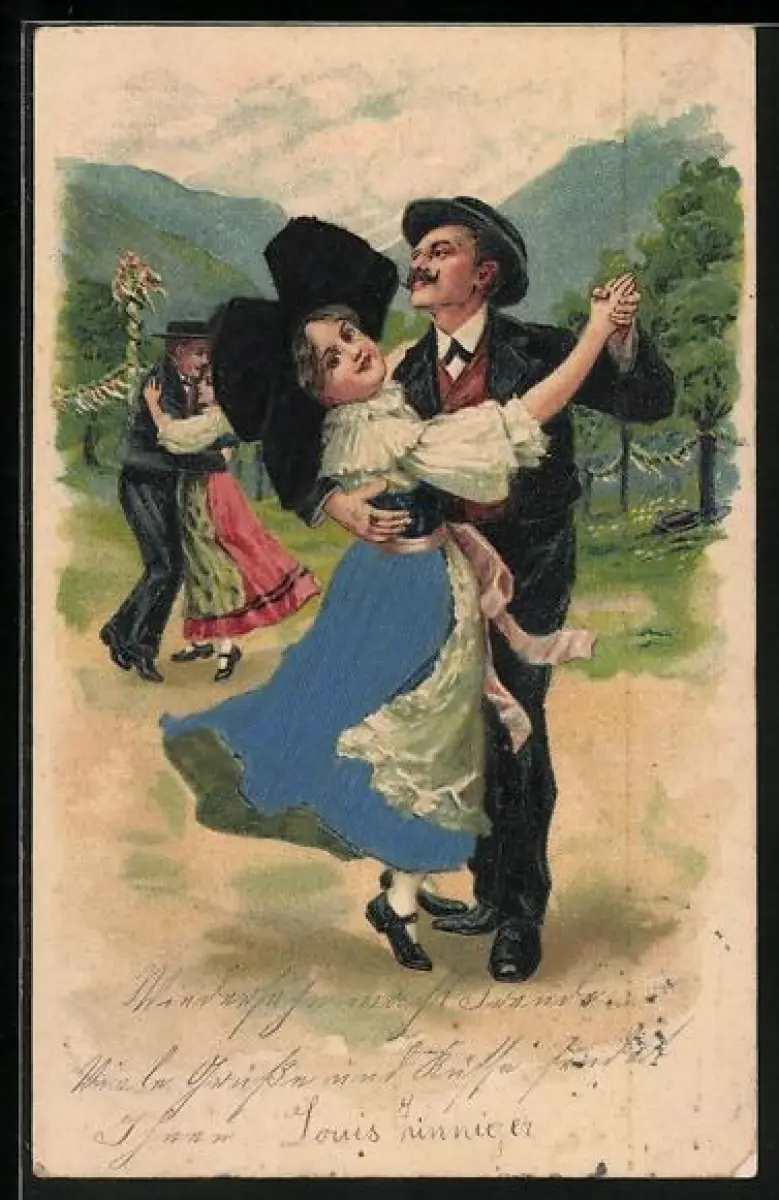 Stoff-Präge-AK Paar in Tracht beim Volkstanz
