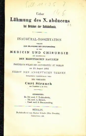 Strauch, Curt: Ueber Lähmung des N. abducens bei Brüchen der Schädelbasis. Dissertation an der Friedrich-Wilhelms-Universität zu Berlin, August 1892.
