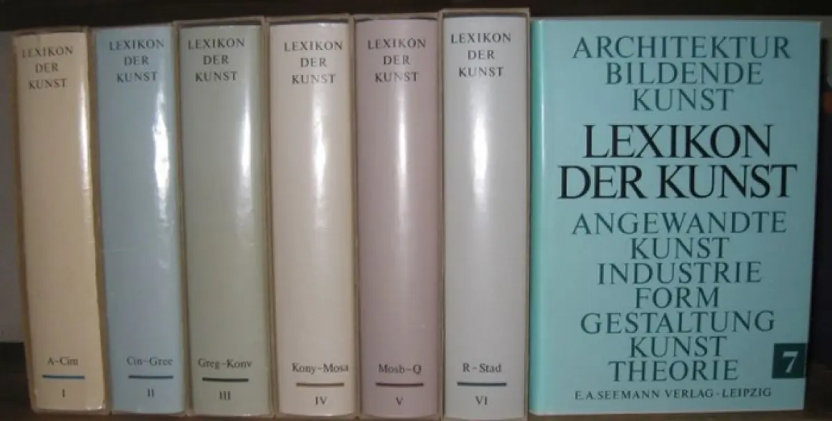 Strauss, Gerhard (Begr.) / Harald Olrich, Dieter Dolgner, Hubert Faensen u.a. (Hrsg.): Lexikon der Kunst. 7 Bände A-Z. Architektur, Bildende Kunst, Angewandte Kunst, Industrieformgestaltung, Kunsttheorie.