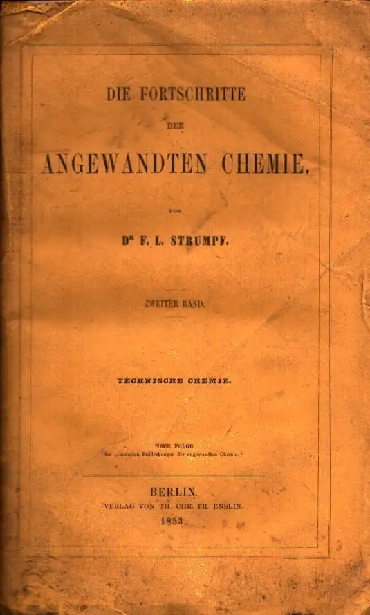 Berlin, Th. Chr. Fr. Enslin, 1853, XXXII, 392 S. Mit Holzschnitten (= Die Fortschritte der angewandten Chemie, Bd. 2. NF der "neuesten Entdeckungen der angewandten Chemie."). 22,5 cm. Bedruckte OBroschur.
