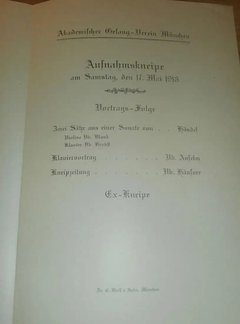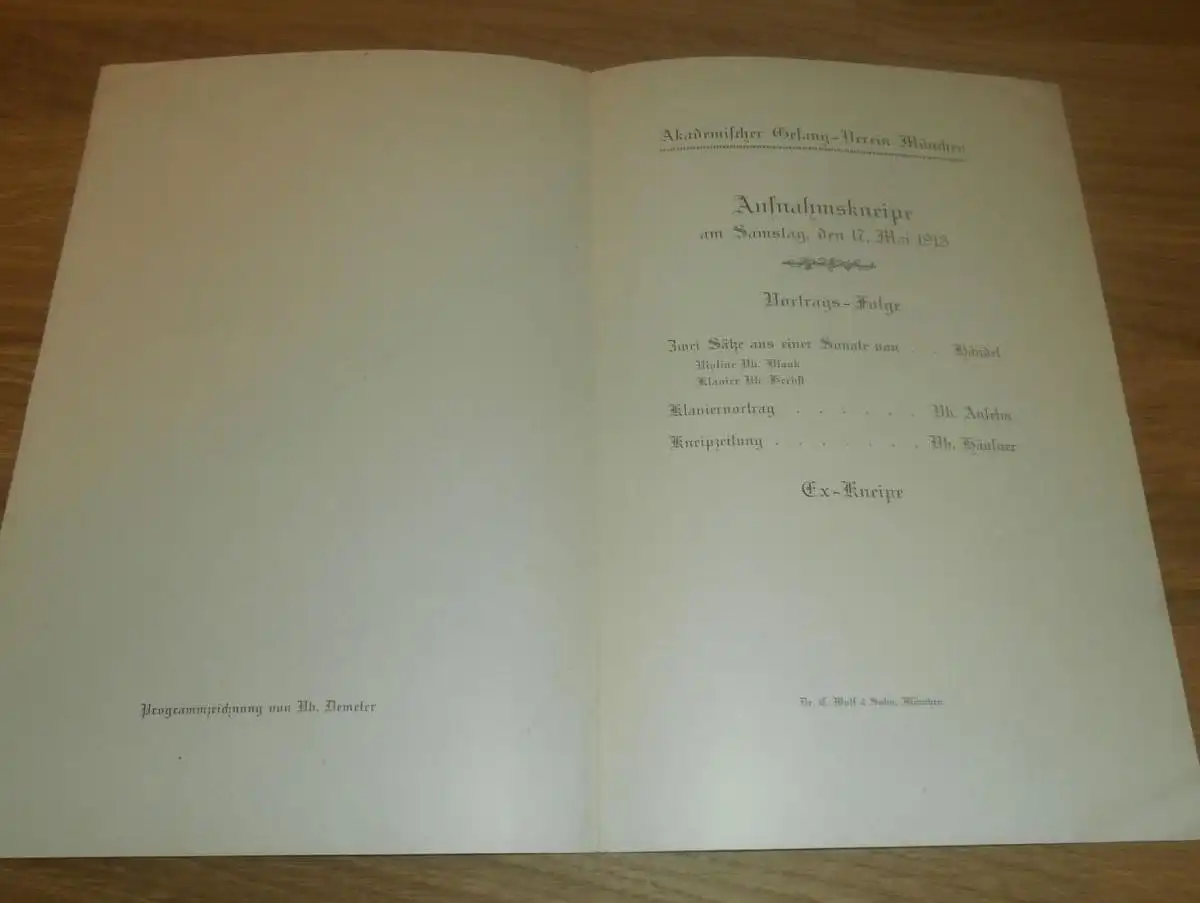 Studentika , München 17.05.1913 , akademischer Gesangverein , Kneipe , Sonate , Programm , 26,5 x 17,5 cm , AGV !!!