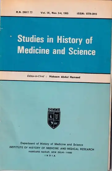 Studies in History of Medicine and Science.- Hakeem Abdul Hameed (Ed.): Vol. IX, Nos.3-4, 1985: Studies in History of Medicine and Science. Contents: A new manuscript of prophet´s medicine by Jalal al-Din al Suyuti / Riyad-i Alamgiri - a medical manuscrip