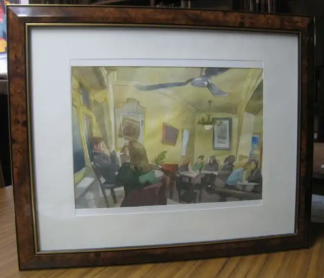 Freie Beschreibung: Originales Aquarell (Bildgröße: 25,8 x 35,8 cm) im Querformat, rückseitig an 2 Stellen des oberen Randes mit säurefreiem Filmoplast unter ein breites Passepartout geheftet, sowie im dekorativen Holzrahmen unter Glas gerahmt (Gesamtgröße: 47 x 57 cm). Am linken unteren Bildrand vom Künstler in Bleistift voll signiert und datiert, rückseitig in Buntstift betitelt und nummeriert: T. 132 / 15. Sehr guter Zustand