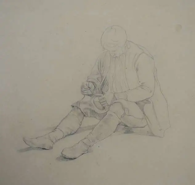 Blattfüllende Zeichnung eines sitzenden Mannes in Tracht beim Umwickeln eines Ringes. Besondere Sorgfalt verwendet der Zeichner auf die Haltung von Beinen und die Modellierung der arbeitenden Hände. Kopf und Rumpf der Figur sind auf die Umrisse reduziert. - Wenige unbedeutende Fleckchen