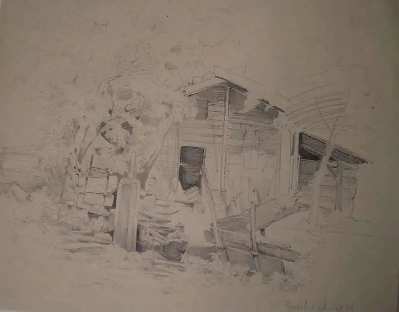 Teils skizzierte, teils fein ausgeführte Darstellung eines oberbayrischen, vom Verfall bedrohten Bauernhauses. Während das hölzerne Gebäude noch intakt erscheint, ist der Holzzaun bereits umgestützt und wird von Büschen überwuchert, zahlreiche Arbeitsgeräte liegen achtlos herum. - Links unten mit sehr kl. Fleck. - Versandkosten auf Anfrage