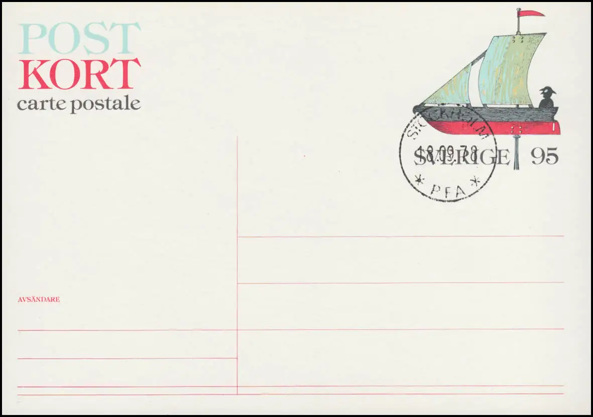 Suède Carte postale P 100 voilier 95 Öre 1977, cacheté