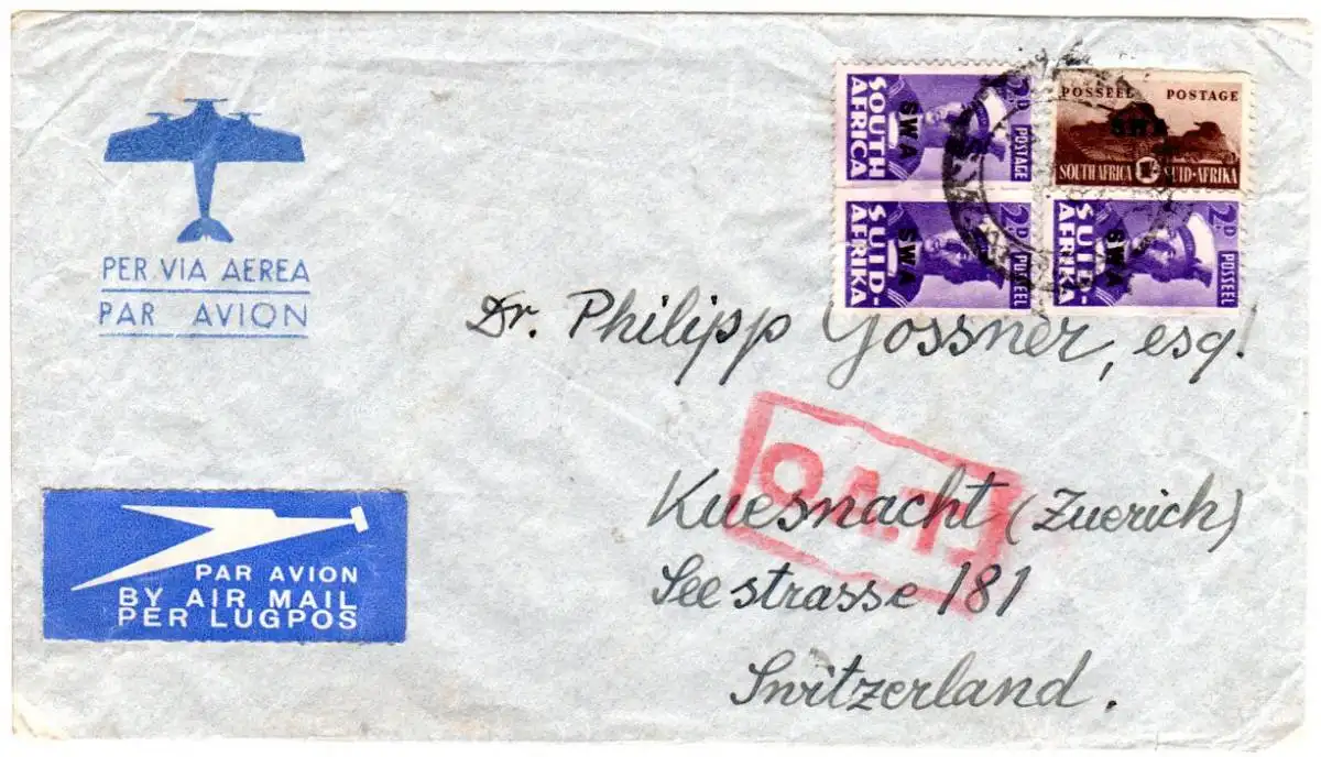 4 Marken m. SWA-Aufdruck u. 3-sprachiges Luftpostetikett auf Luftpostbrief v. Windhoek n. Küsnacht i.d. Schweiz. Roter Luftpost-Weiterbeförderungs-R1 O.A.T.