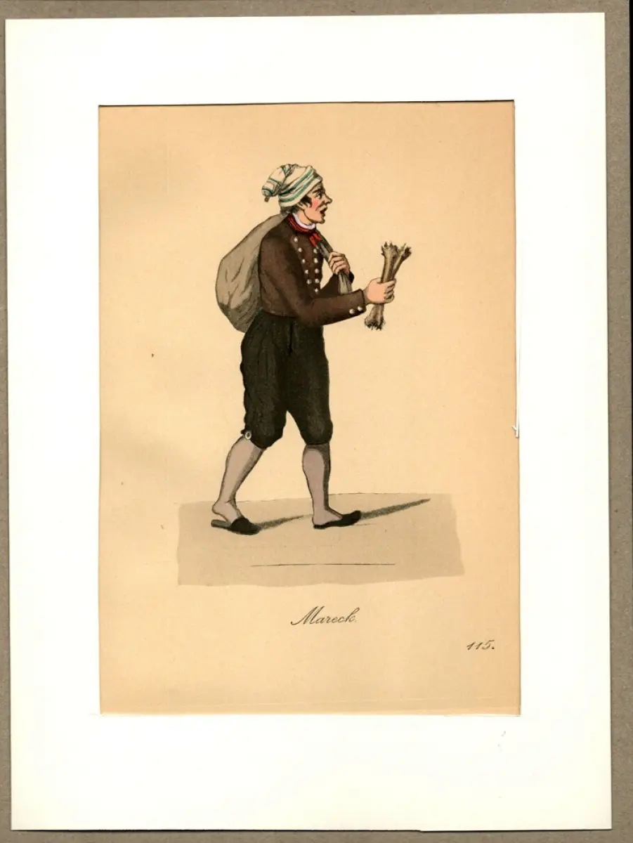 Titel: Mareek, Mareek! [Kauft Meerrettiche!]. Meerrettichverkäufer | Horseradish Vendor. Original-Lithographie, altkoloriert