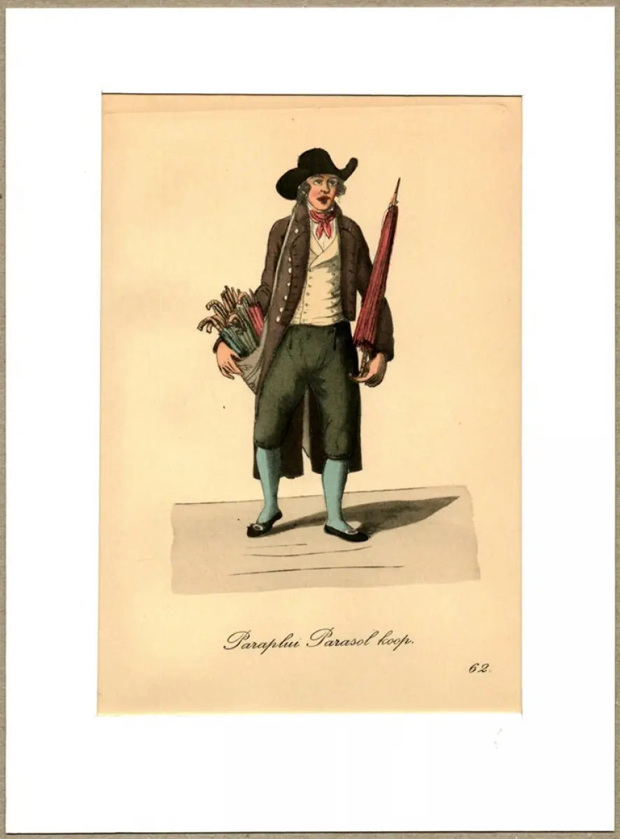 Titel: Paraplui Parasol koop! [Regenschirme! Sonnenschirme hier!]. Schirmverkäufer | Umbrella Seller. Original-Lithographie, altkoloriert