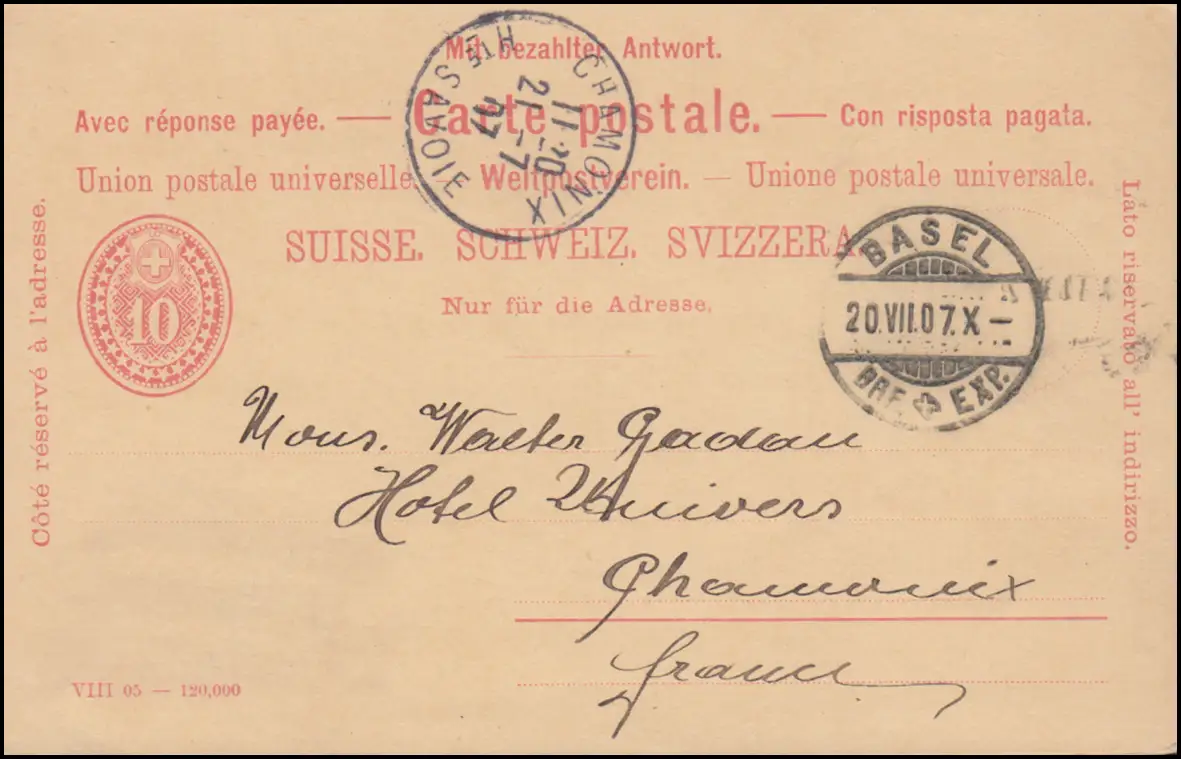 vers la France, timbre d'arrivée CHAMONIX SAVOIE 21.7.07 Numéro de catalogue: P21 Examen: original Référence produit: 00000000028371