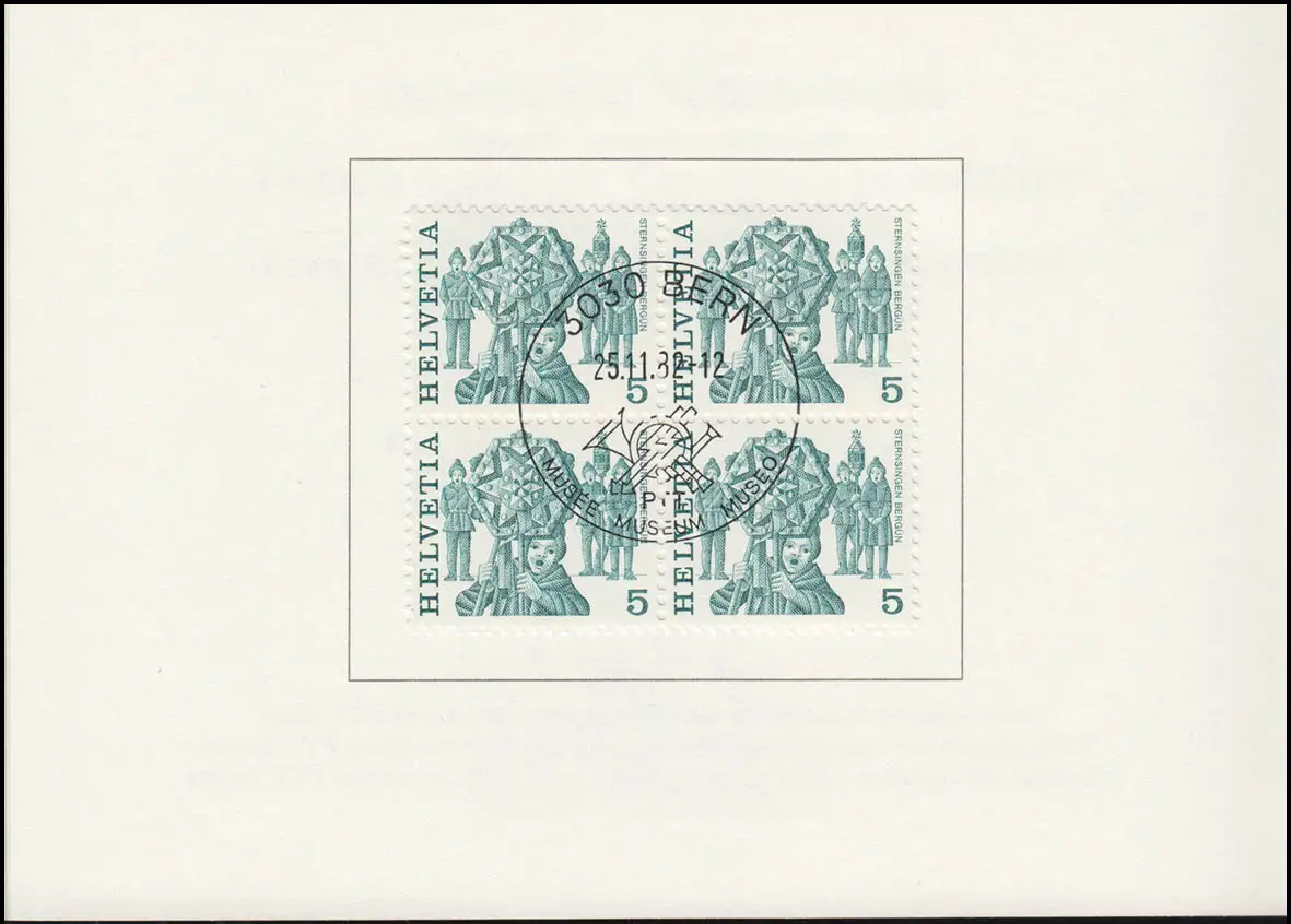 Présenté par les entreprises suisses PTT "Traitements populaires" (MICHEL 1100-1008) en tant que phrase complète de 9 valeurs en blocs de verriers chacun avec le cachet spécial "BERN PITT-Museum 25.11.82" Numéro de catalogue: 11001-108A Examen: original Référence produit: 87900110051100>Attention: Cet article est ou a été disponible plusieurs fois. La figure montre l'un de ces articles en un exemplaire. Cette marque fournie a uniquement les caractéristiques indiquées dans la description et peut donc différer de l ' image. Toutefois, en particulier pour les marques marquées, nous nous efforçons de fournir l\'article représenté. Si cela est une condition pour vous, veuillez nous le faire savoir.