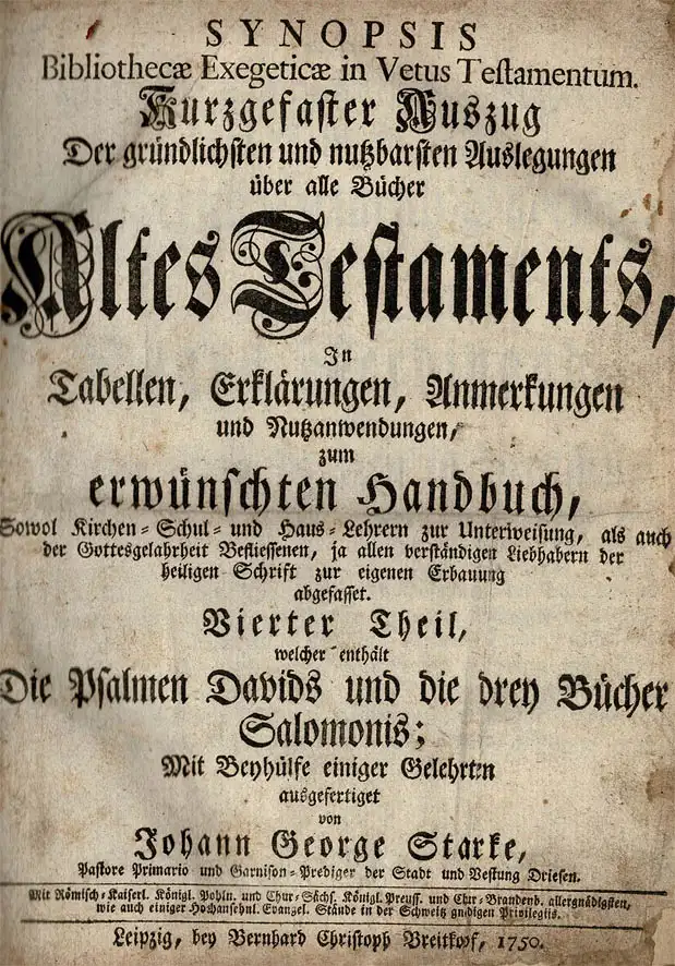 Synopsis Bibliothecae Exegeticae in Vetus Testamentum. Kurzgefaster Auszug. Der gründlichsten und nutzbarsten Auslegungen über alle Bücher Altes Testaments … Vierter Theil, welcher enthält Die Psalmen Davids ….