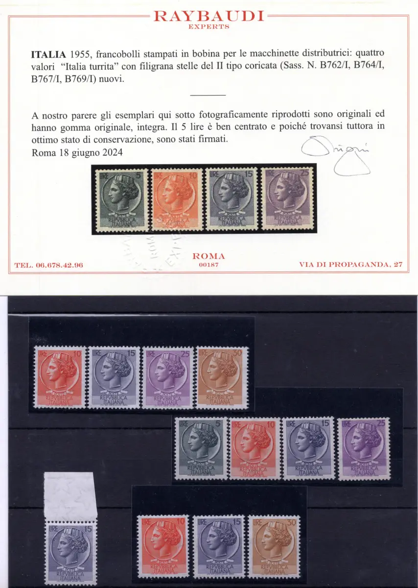 MNH - Vollgummi - - Syrakus Ausgabe für Verteilmaschinen - Die komplette Serie 11 Werte der Briefmarken mit filigranen Sternen I. und IV. vertikaler Typ und Sterne II liegend (Sass. n. B 764/770, B 762/I - B 769/I, B 764/II - B 770/II) - Seltenes Set in sehr gutem Erhaltungszustand - Zert. Ray. für die liegende Serie Sterne II - Kat. euro 2.393 Cod.610/182