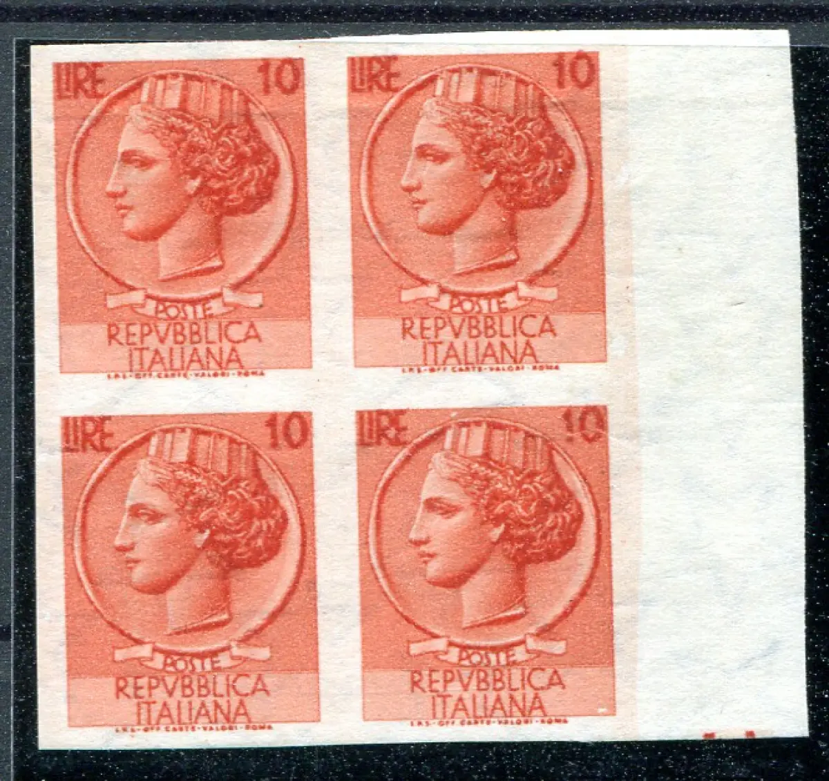 Syrakus Lire 10 ungezahnte Sorten Ohne Gummi - Syrakus Lire 10 Nr. 764 Viertel ungezähnt b. von f. (ohne Randdekoration) filigran Sterne I. vertikaler Typ (Griffe Nr. 2/I Pergolesi) - ohne Gummi - Sorani Cod. 600/13