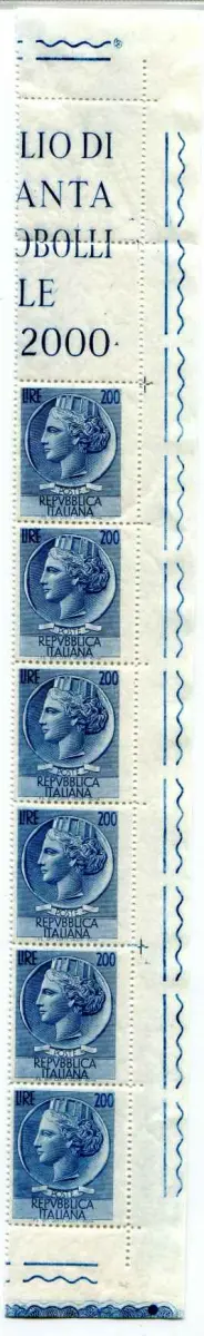 Syrakus Lire 200 Sorten vertikale Verzahnung nach außen verschoben Vollgummi - Syrakus Lire 200 Nr. 826 vertikaler Streifen von sechs Exemplaren a. von f. mit stark nach außen verschobener rechter vertikaler Verzahnung - breitere Briefmarken - Interessanter Code 485/7