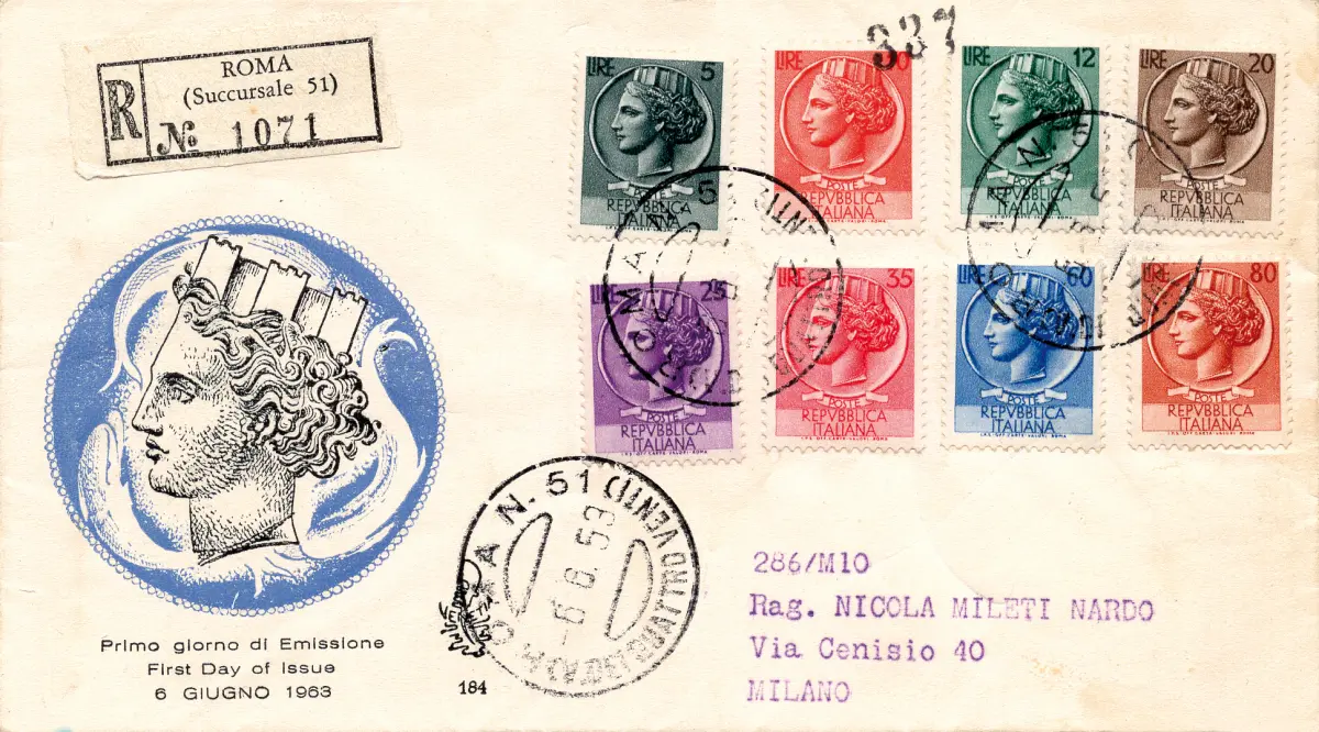 BEUTEL - Syrakus acht Werte filigran Rad auf Einschreiben Umschlag für Mailand mit Ankunftsstornierung - Selten Cod.514/182