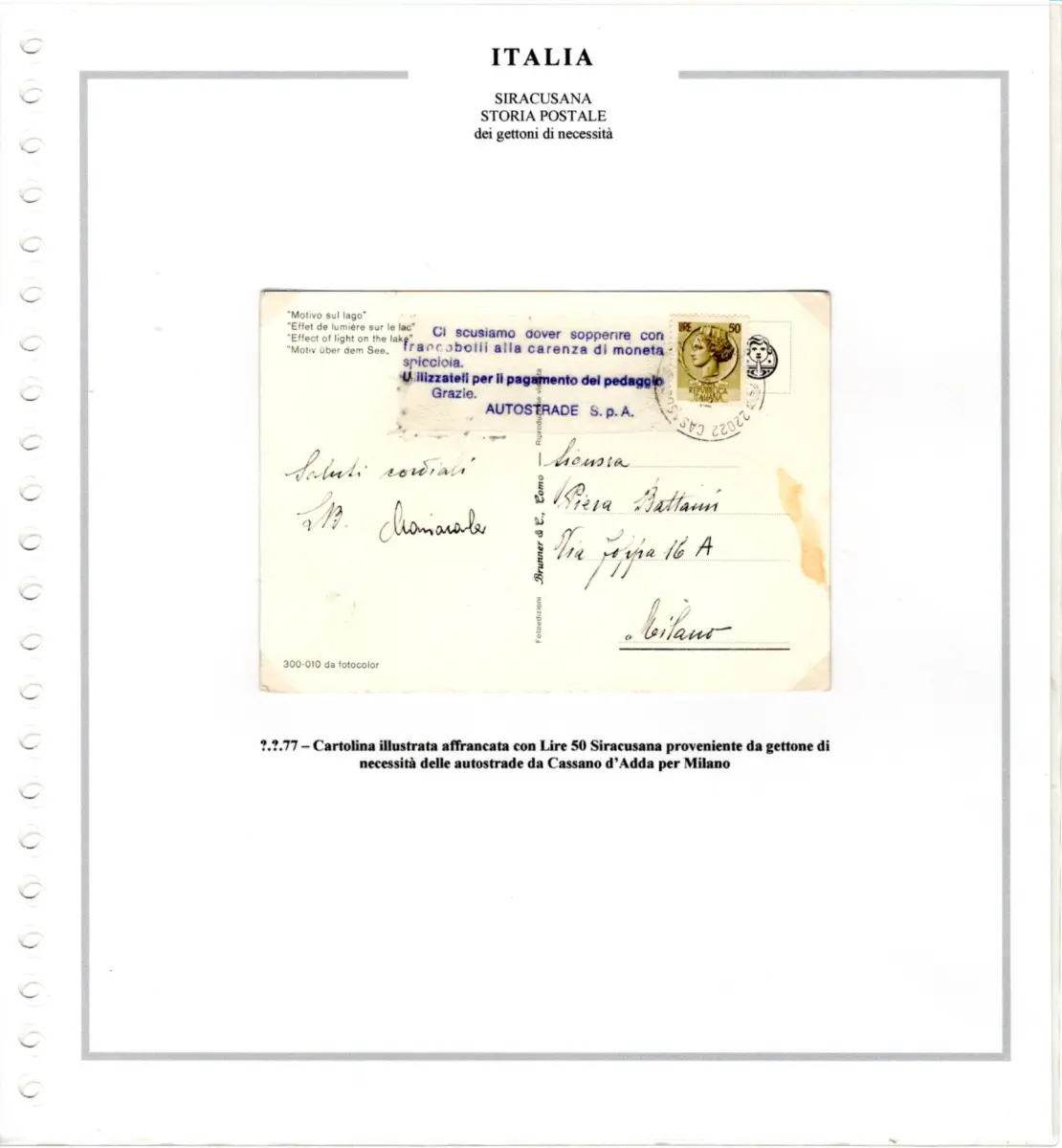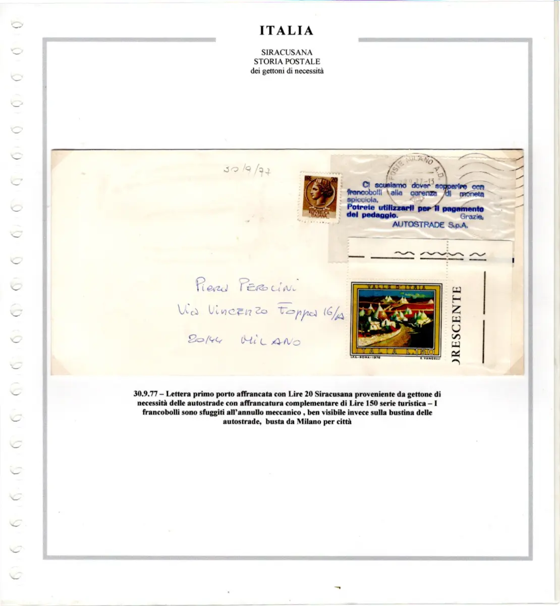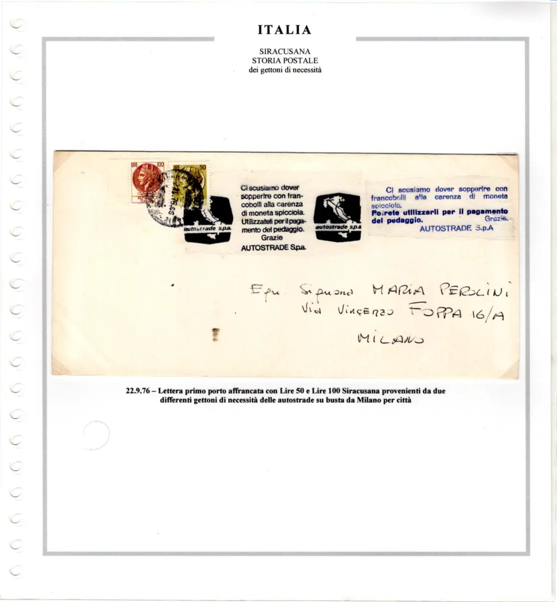Umschlag - Sammlung auf Marini-Blättern montiert - Enthält 3 verschiedene Bedarfsmarken der italienischen Autobahnen und 7 posthistorische Dokumente, alle frankiert mit Werten der Syrakus-Serie - Seltenes Set für Spezialisten der Serie Cod. 4010 / WEB
