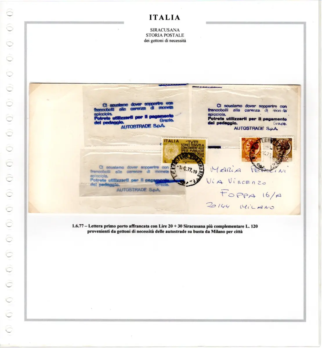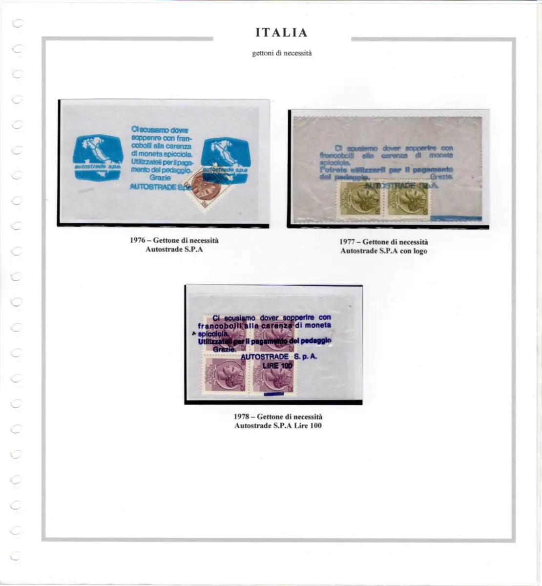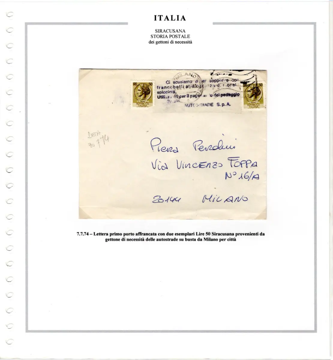 Umschlag - Sammlung auf Marini-Blättern montiert - Enthält 3 verschiedene Bedarfsmarken der italienischen Autobahnen und 7 posthistorische Dokumente, alle frankiert mit Werten der Syrakus-Serie - Seltenes Set für Spezialisten der Serie Cod. 4010 / WEB