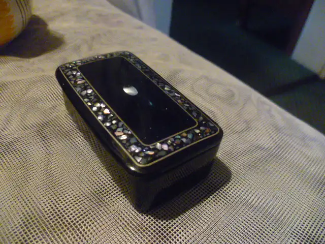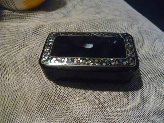 Tabatiere Schnupftabak Snuff Box Schwarzlack Perlmutt Einlagen Bakelit Pappe Dose Vitrine H ; 7,5 x 4 x 3 cm