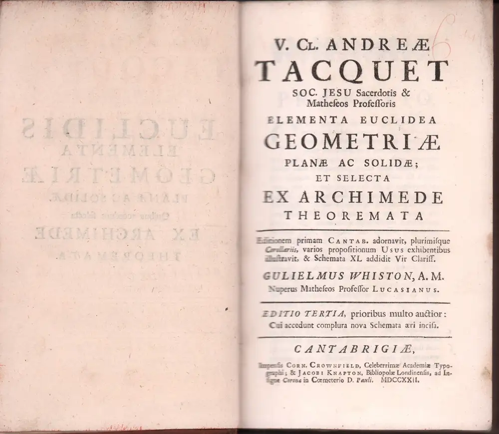 Tacquet, Andrae: Elementa Euclidea geometriae planae ac solidae. Et selecta ex Archimede theoremata. Editio tertia, prioribus multo auctior. Editionem primam Cantab. adornavit, plurimisque Corollariis, varios propositionum Usus exhibentibus illustravit, &