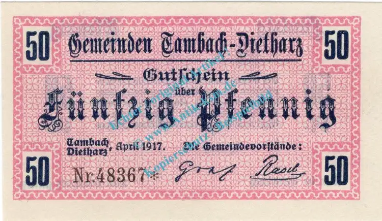Tambach , Notgeld 50 Pfennig Schein in kfr. Tieste 7260.05.25 , Thüringen 1917 Verkehrsausgabe