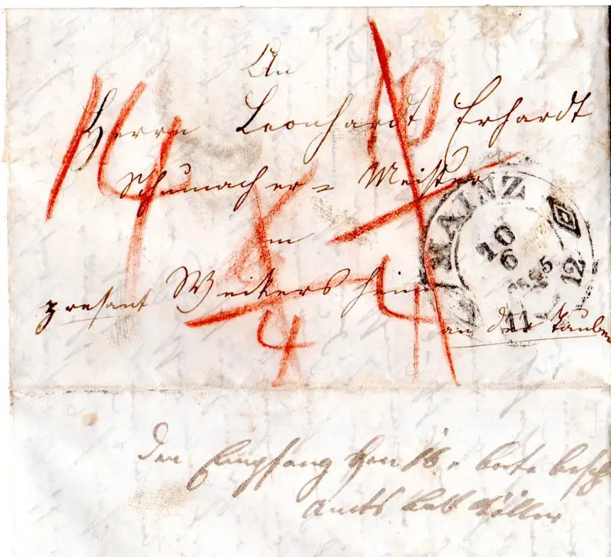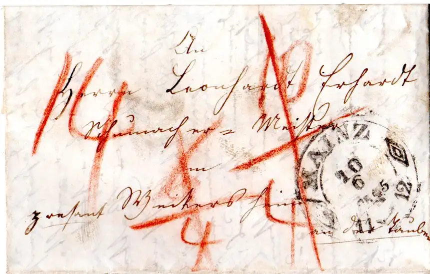 Taxis 1845, Zier-K2 Mainz auf Brief n. Württemberg m. rücks. Empfangsbestätigung