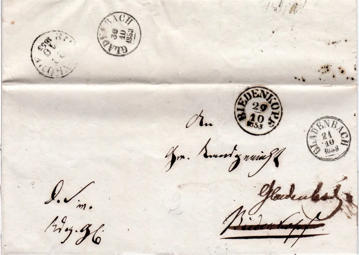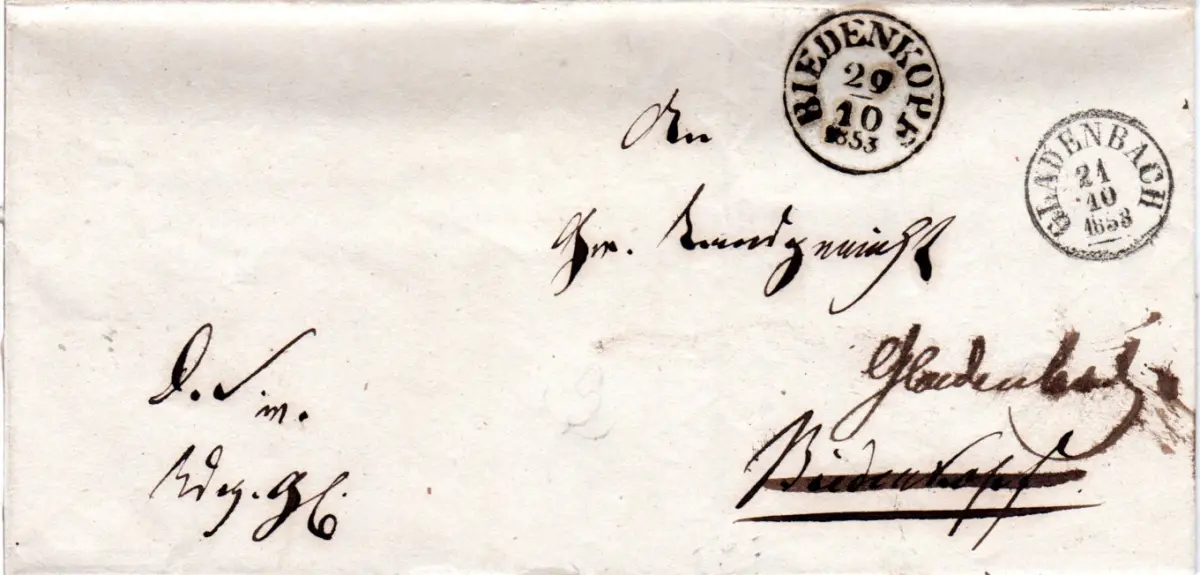 Taxis 1853, K1 Gladenbach u. Biedenkopf je klar auf Nachsende Brief