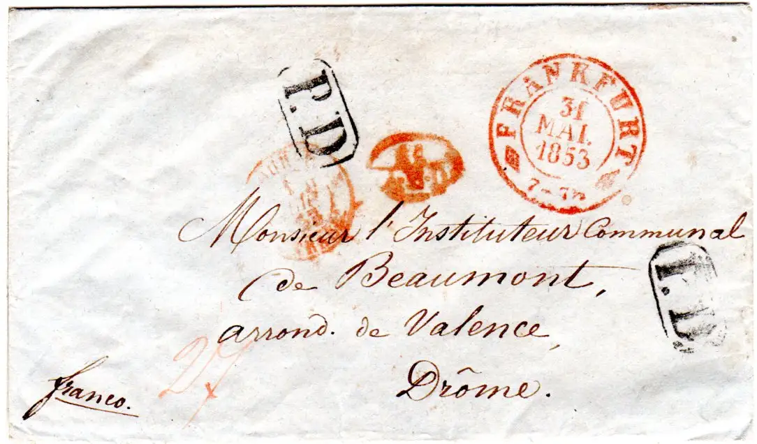 Taxis 1853, rote K2 Frankfurt u. II AED sowie P.D auf Franko Brief n. Frankreich