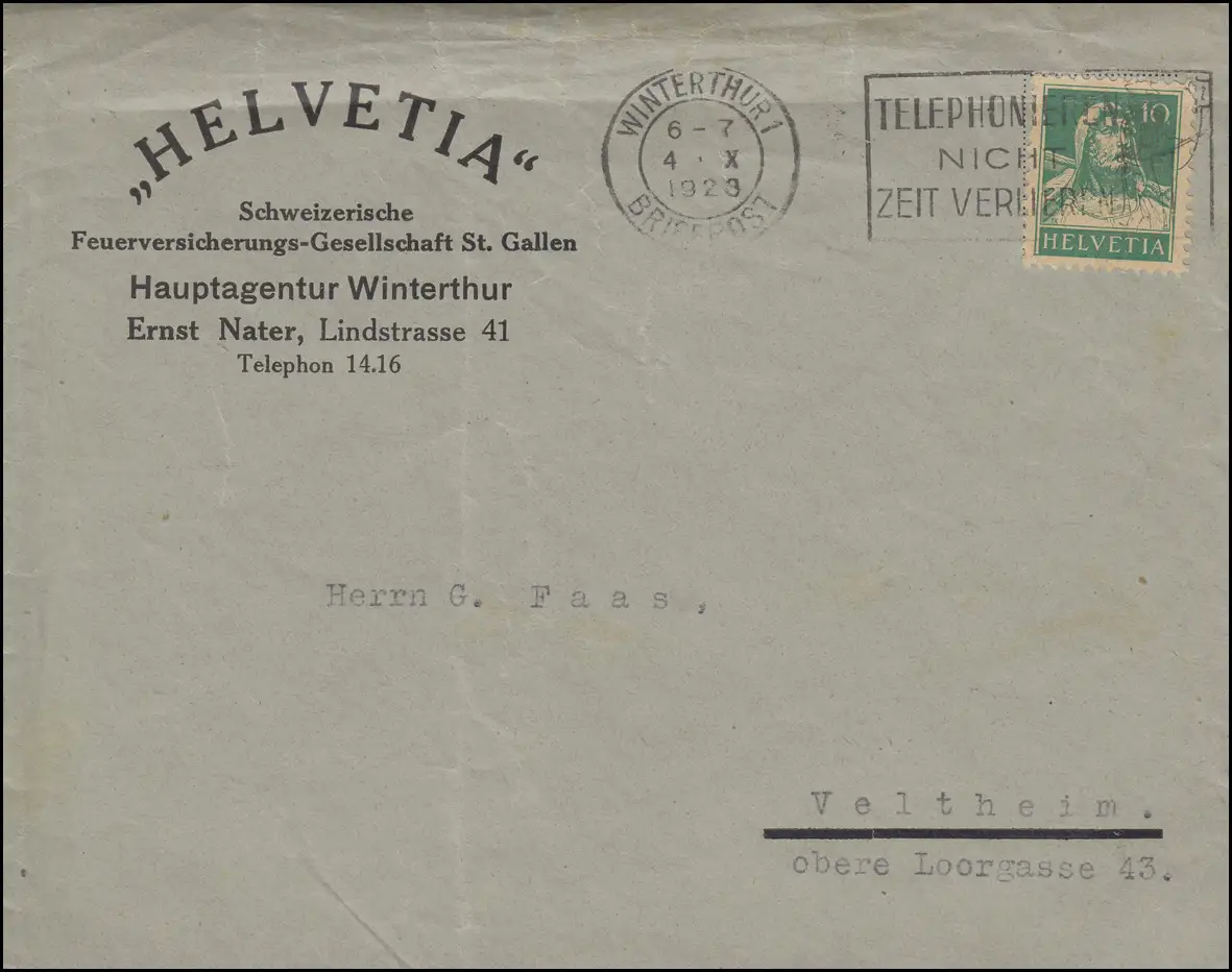 Tell avec arbalète 10 C EF lettre assurance incendie WINTERTHUR Téléphoner 4.9.23