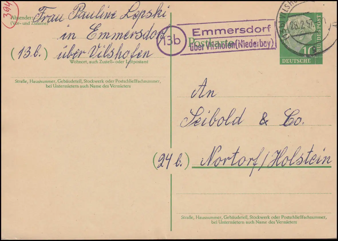 Temple de Landpost Emmersdorf par l'intermédiaire de VILSHORFEN (NIERDERBAY.) 28.2.1957 sur carte postale