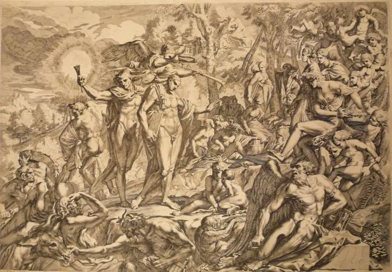 Vgl. Bartsch 32 (Testa). Gegenseitige Kopie nach Pietro Testa. Die Schrift unterhalb der Darstellung gelöscht. Großformatiges Blatt. - Der Augsburger Stecher G. A. Wolfgang erlernte zunächst die Goldschmiedekunst und ging dann bei M. Küsel in die Lehre als Kupferstecher. - Schwache Knick- bzw. Quetschspuren, geglättet. In den Ecken mit Montierungsresten