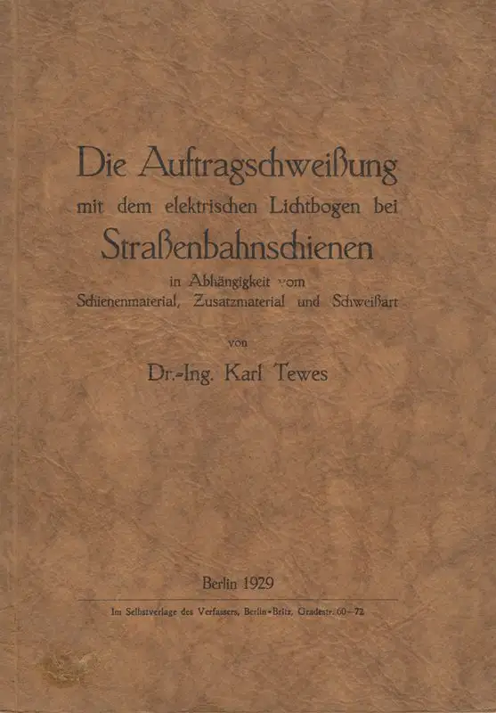Tewes, Karl: Die Auftragschweißung mit dem elektrischen Lichtbogen bei Straßenbahnschienen in Abhängigkeit vom Schienenmaterial, Zusatzmaterial und Schweißart.