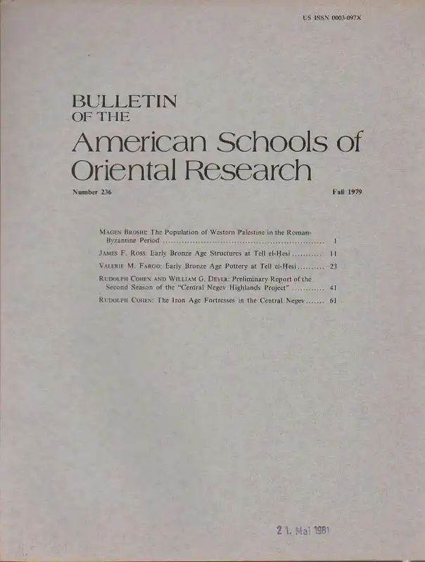 79 S., Quart 28 cm, Broschur, mit Abbildungen. Aus dem Inhalt: The Population of Western Palestine in the Roman-Byzantine Period. Early Bronze Age Structures at Tell el-Hesi Early Bronze Age Pottery at Tell el-Hesi. Preliminary Report of the Second Season of the "Central Negev Highlands Project.