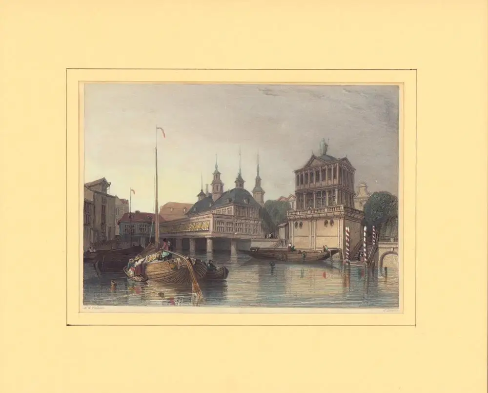 Blick vom Nikolaifleet aus auf die 1558 als erste ihrer Art gegründete, 1578-1583 nach Plänen des Amsterdamer Architekten Jan Andresen erbaute u. im Großen Brand von 1842 zerstörte Hamburger Börse an der Trostbrücke, im Vordergrund Boote u. Lastkähne. - Zu dem Landschafts- u. Marinemaler Alfred Gomersal Vickers (1810-1837) siehe Thieme/Becker 34, S. 328; zu dem Maler, Lithographen u. Kupferstecher John Frederick Lewis (1805-1876) siehe ebda. 23, S. 164. - Mit Eiweiß gehöht. Blatt etwas wellig, im weißen Rand gebräunt