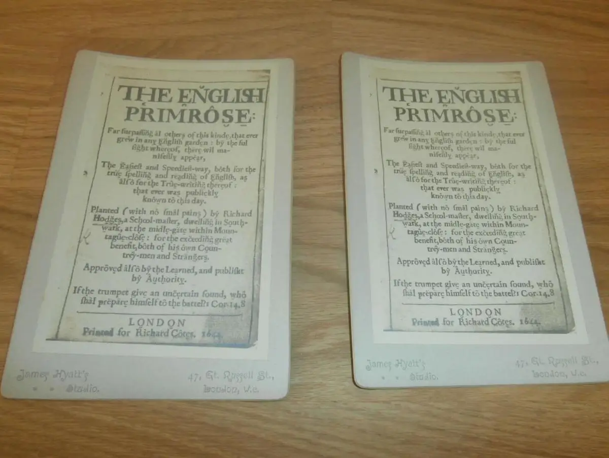 The english primrose , 1644 , 2x altes Foto vom Originalbuch auf Pappe , ca. 1890 , James Hyatts Studio , London !!!