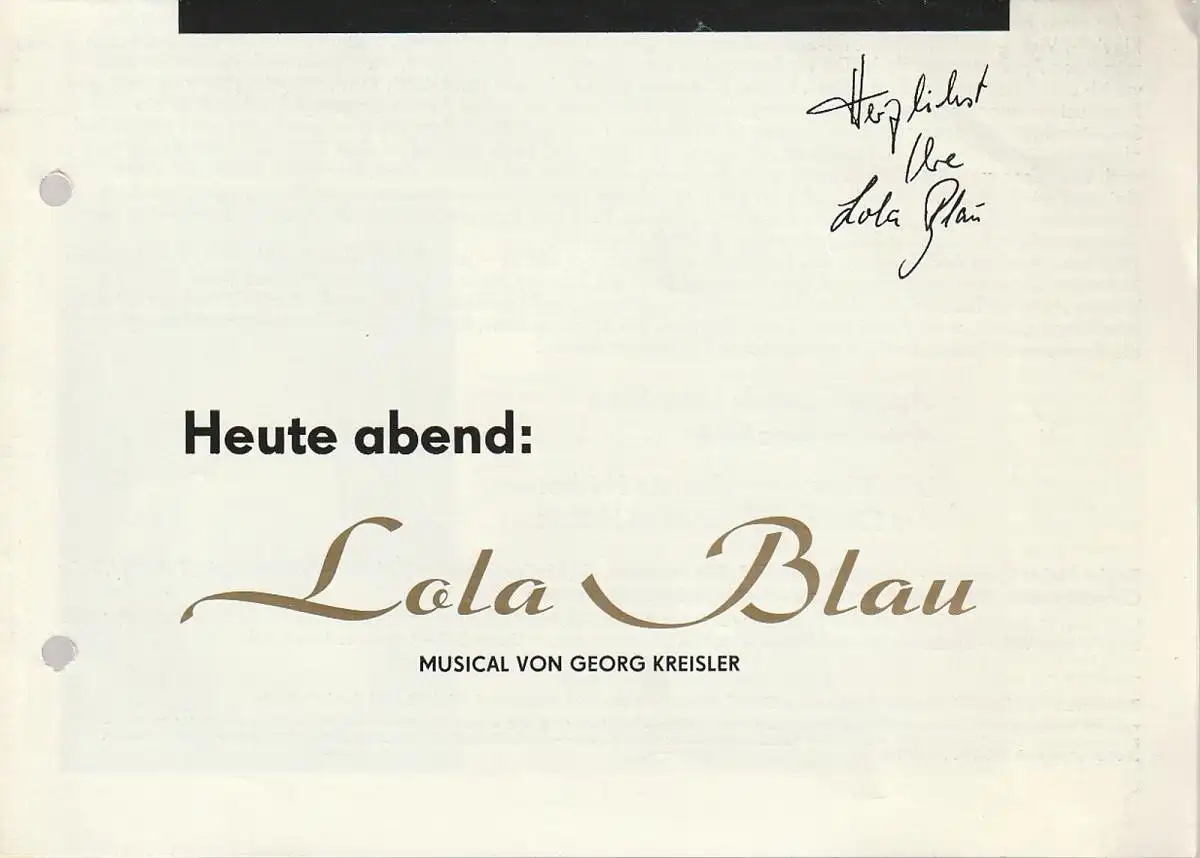 original einmal gefalteter Bogen, Format ca. 15 x 21 cm, 4 Seiten, Foto der Darsellerin und des Komponisten. Zustand: gut bis sehr gut, Ablagelochung