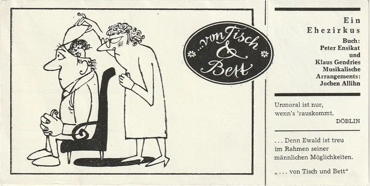 Ein Ehezirkus. Buch: Peter Ensikat und Klaus Gendries. Musikalische Arrangements: Jochen Allihn. Inszenierung: Horst Ludwig. Musikalische Leitung: Friedrich Jahn. Ausstattung: Horst Leiteritz. Choreographische Mitarbeit: Bruno Wolf. Mitwirkende: Erika Reinwald, Hans-Joachim Schröpfer - Schlüsselwörter: Theaterprogramm, Opernprogramm, Ballettprogramm, Musicalprogramm, Konzertprogramm, Theatermemorabilia, Programmhefte Sammlung, deutsche Theatergeschichte.