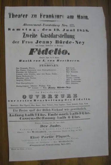 Titel: Besetzungsliste zu: Fidelio. Samstag, den 19. Juni 1858, Abonnement-Vorstellung Nro. 175 im Theater zu Frankfurt am Main. - Zweite Gastdarstellung der Frau Jenny Bürde-Ney ( als Leonore ) vom königl. Hoftheater zu Dresden. - Grosse Oper in 2 Acten, Musik von L. van Beethoven. - Darsteller: die Herren Leser, ( Carl ) Pichler, Baumann, ( Wilhelm Georg ) Dettmer, C. Schneider, Zimmermann und Zielfelder / Fräulein ( Toni ) Labitzki