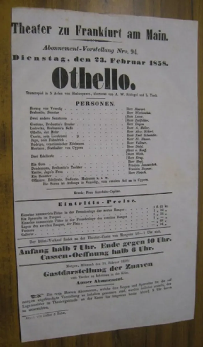 Theater zu Frankfurt am Main. - Intendanz: Roderich Benedix. - William Shakespeare. - August Wilhelm Schlegel und Ludwig Tieck: Besetzungsliste zu: Othello. Dienstag, den 23. Februar 1858, Abonnement-Vorstellung Nro. 94 im Theater zu Frankfurt am Main. -
