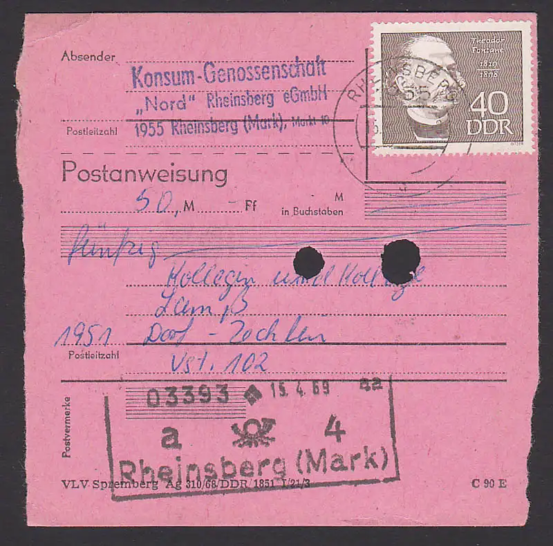 Theodor Fontane Nauen MiNr. 1443 Einzahlungs-Anweisung 15.4.69, Rheinsberg (Mark)