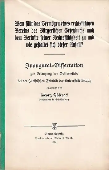 Thierack, (Otto) Georg: Wem fällt das Vermögen eines rechtsfähigen Vereins des Bürgerlichen Gesetzbuchs nach dem Verlust seiner Rechtsfähigkeit zu und wie gestaltet sich dieser Anfall ? Inaugural-Dissertation ..._bei der Universität Leipzig.