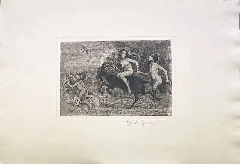 Beringer 37, 3 (v. 3). - Der deutsche Maler, Grafiker und Schriftsteller Hans Thoma studierte von 1859 bis 1866 an der Großherzoglichen Kunstschule in Karlsruhe, wo er u. a. Schüler von Johann Wilhelm Schirmer und Ludwig Des Coudres war. Es folgen Studienreisen nach Paris. 1870-73 lebt er in München, wo er mit den Malern Arnold Böcklin, Albert Lang, Wilhelm Leibl, Ernst Sattler, Carl Schuch und Wilhelm Trübner Freundschaft schließt. Im Jahr 1890 gelingt ihm mit einer Ausstellung im Münchener Kunstverein der künstlerische Durchbruch. 1892 ist Thoma auf dem Höhepunkt seiner Kariere, es folgt der Umzug nach Karlsruhe. 1899 wurde Hans Thoma zum Professor an der Großherzoglichen Kunstschule in Karlsruhe und zum Direktor der Kunsthalle Karlsruhe ernannt. Dieses Amt übte er bis 1919 aus. - Im breiten Rand mit kleineren Stockfleckchen und teils, zum Außenrand hin, wenig lichtgebräunt. Obere linke Ecke mit kleinerer Knickspur.Verso in den oberen Ecke Reste einer alten Montierung