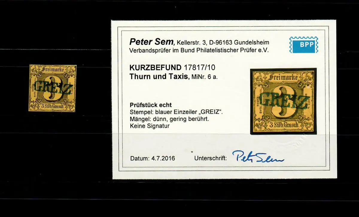 Thurn & Taxis: MiNr. 6a, cacheté GRIZ, BPP résultat