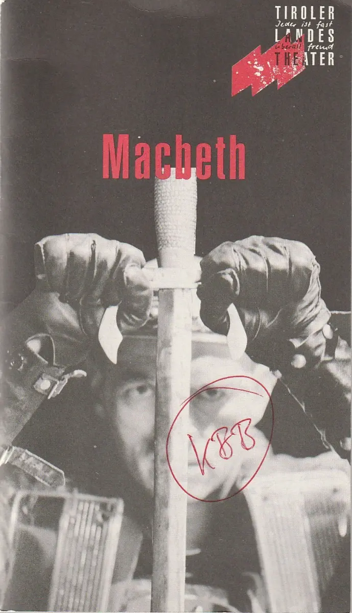 Nach William Shakespeare von Heiner Müller. Inszenierung: Dietrich W. Hübsch. Ausstattung: Thomas Richter-Forgach. Musik: Peter Herborn. Choreographie: Regina Weber. Kampfszene: Andrej Diamantstein. Mitwirkende: Norbert Aberle, Erich Röder, Roland Silbernagel, Andrej Diamantstein, Peter Zimmermann, Hans Sigl, Achim Conrad, Johannes Nikolussi, u.a. - Theaterprogramm, Opernprogramm, Ballettprogramm, Musicalprogramm, Konzertprogramm, Theatermemorabilia, Programmhefte Sammlung, deutsche Theatergeschichte.