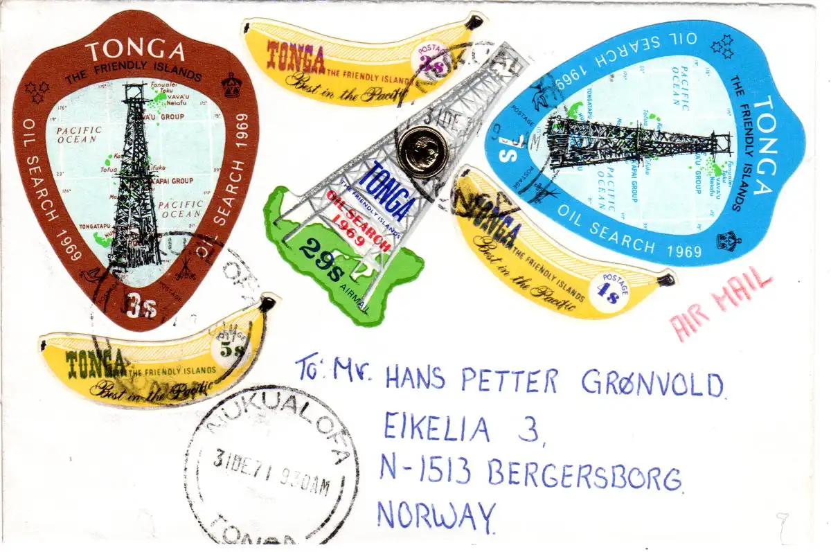 Tonga 1971, 3 Erdöl u. 3 Banane Marken auf Brief v. Nukualofa n. Norwegen