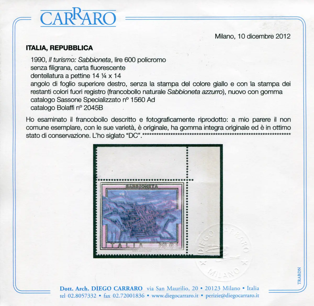 Tourist '90 Lire 600 Sabbiont Sorte ohne gelben Vollgummi - MHN - - Touristica '90 Lire 600 Sabbionta bell'Exemplar a. von f. ohne Gelbdruck - Naturmarke Blauer Sabbiont (Kat. Bolaffi Nr. 2045B) - Selten - Zert. Carraro Cod. 751/14