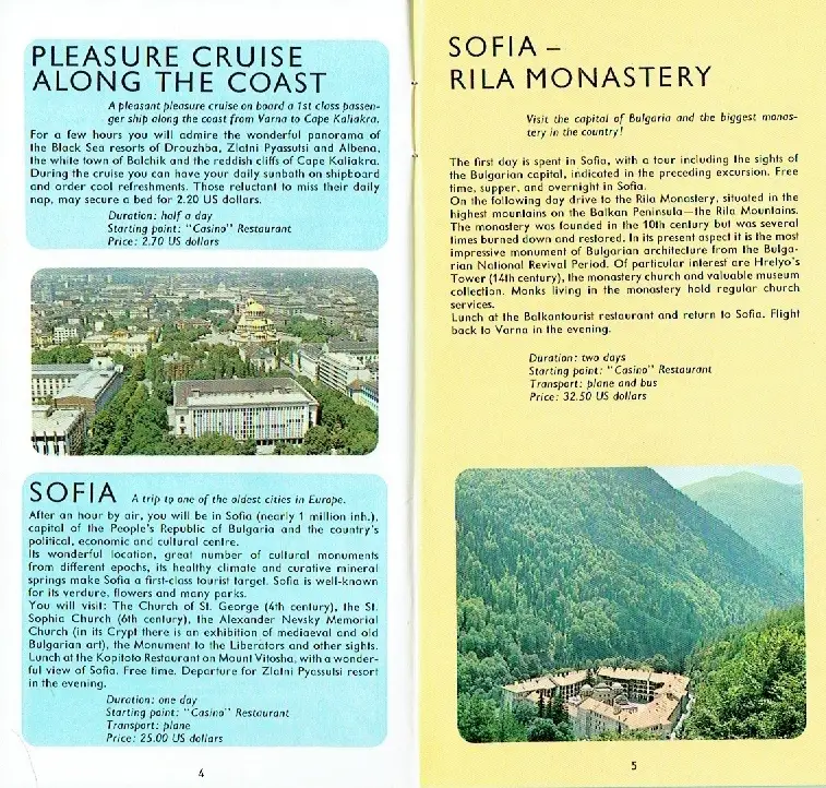 sehr guter Zustand, geringe Gebrauchs- und Alterungsspuren, TOURS lN THE COUNTRY - Tour of Varna - Balchik - Cape Kaliakra - Pleasure cruise along the seacoast .. - Sofia - Sofia — Rila Monasfery - Veliko Tirnovo - Nessebur — Slunchev Bryag - Southern Coast - Madara — Shoumen - Kotel — Village of Zheravna - Small tour round Bulgaria - Tour round Bulgaria - TOURS ABROAD - Moscow - Bucharest - Mamaia - Athens - Beirut - Cairo - Istanbul - ENTERTAINMENT PROGRAMMES - Robinson - A Bulgarian Village - Picnic - Wine tasting party - Koukeri night club - Galatea restaurant - Tsiganski Tabor night club - Kolibite night club - Folkstyle restauranfs and supper clubs - A Night in Albena - Theatres, Shows, Concerts, Sport, Softcover, ca. 9,5 x 18,5, 24 Seiten mit ca. 20 Bildern