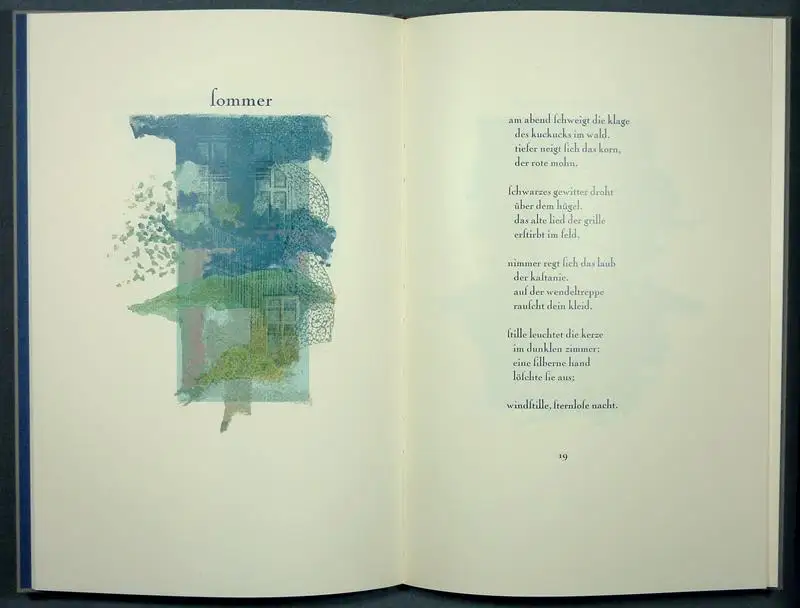 Seitenanzahl: 52 S. Mit 14 ganzseit., mehrfarb. Orig.-Kunstharzstichen v. Roswitha Quadflieg (= Raamin-Press, Druck 11). Kl.-4to. Handgebundener OPp. im OPp-Schuber