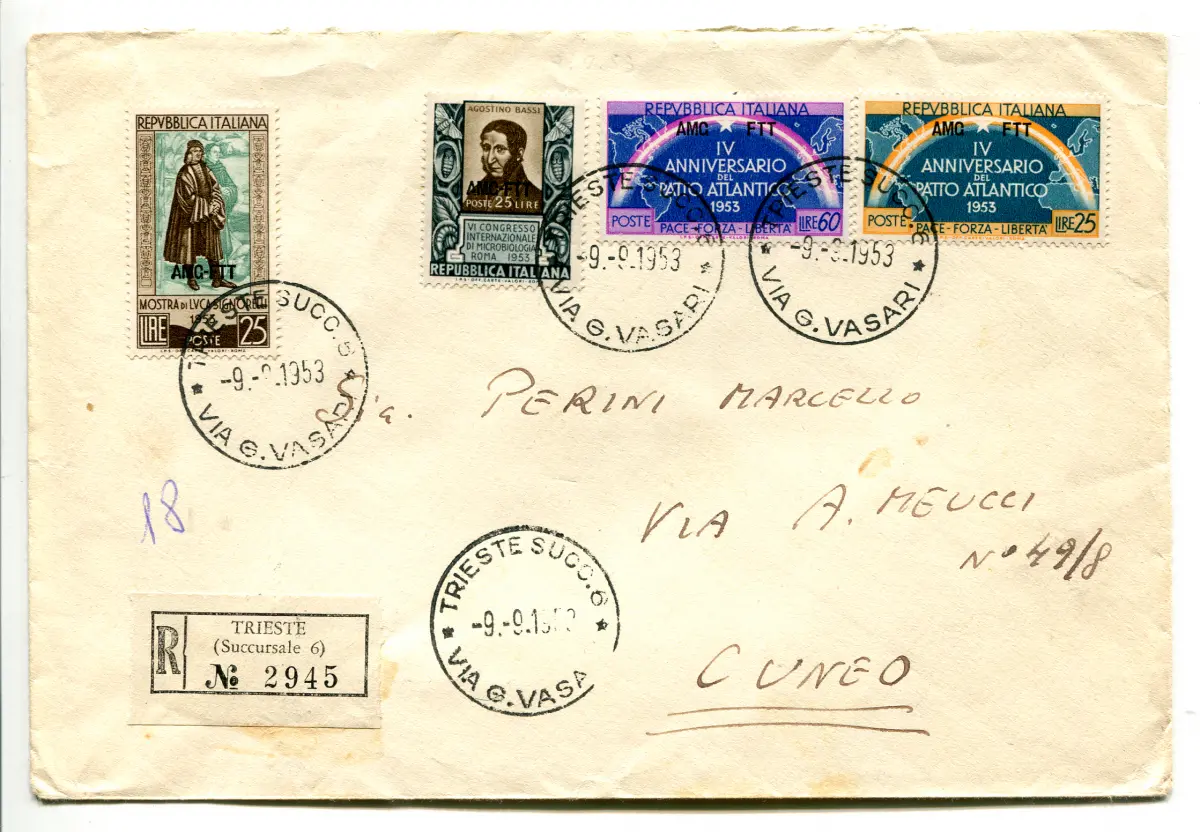 Triest A - Atlantikpakt Serie auf Racc. espresso Umschlag - Trieste A - Atlantikpakt Nr. 184/185 Serie + Ergänzungen Nr. 186 + 187 auf Umschlag Racc. Express für Cuneo am 9.9.53 - Schön und ungewöhnlich Cod.1493/WEB