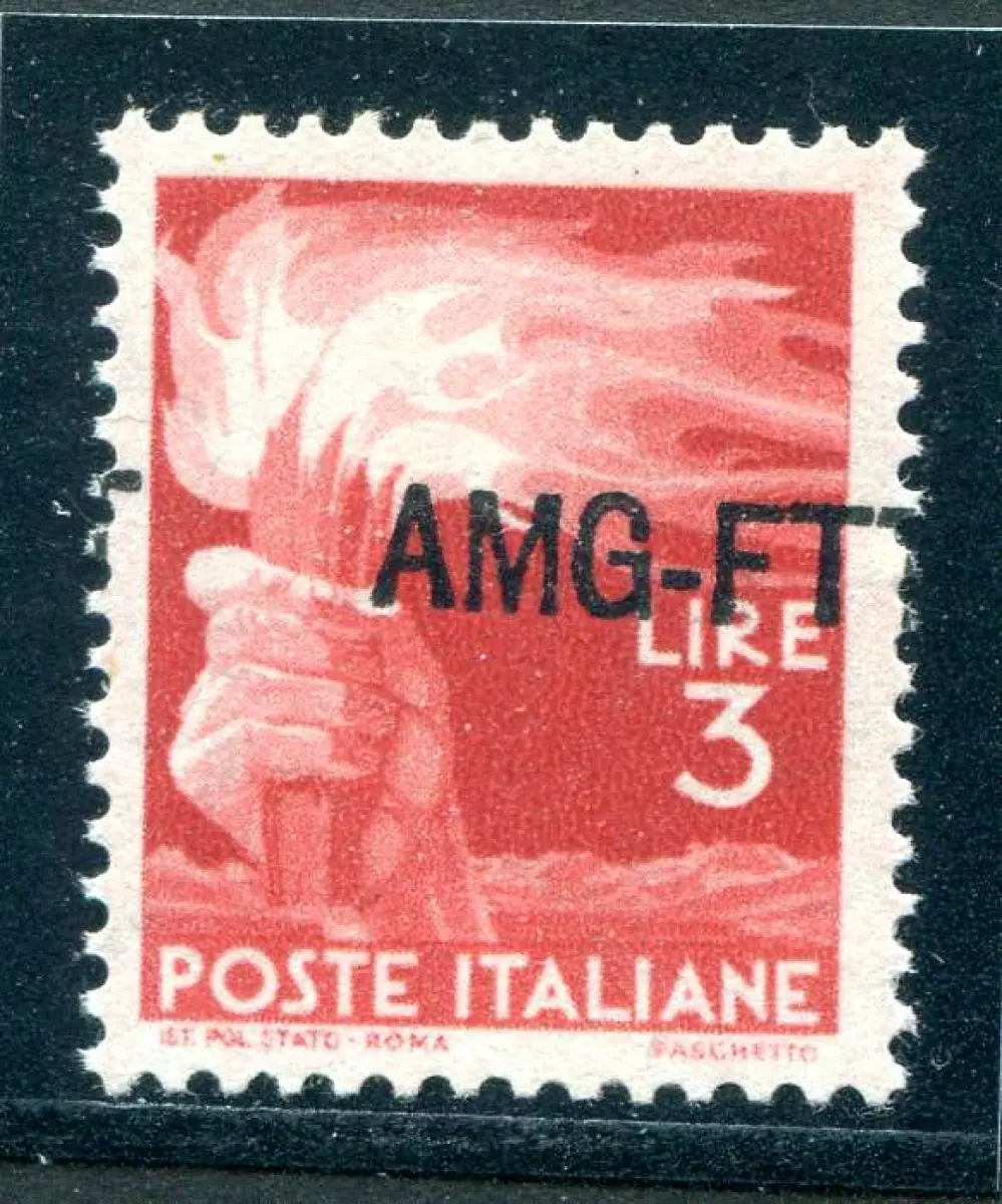 Triest A - Democratica Lire 3 Sorten Nach rechts verschoben Vollgummi - Democratica Lire 3 Nr. 58id stark nach rechts verschobener Aufdruck - zweites T zu Pferd Cod. 1024/13